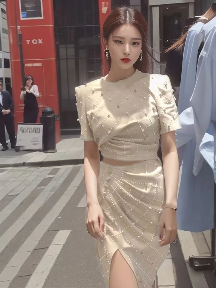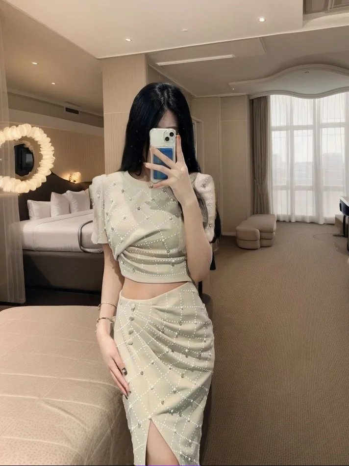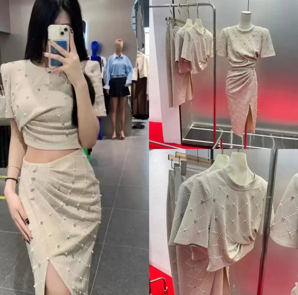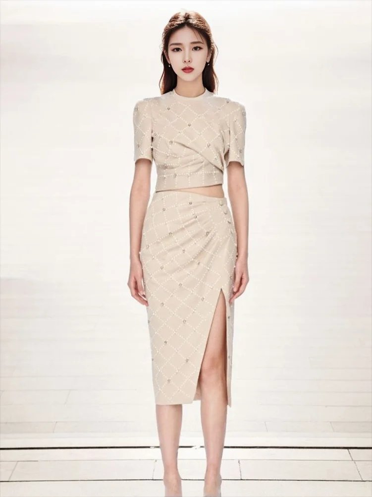 ست دو تکه زنانه مرواریدی – تاپ و دامن بلند مجلسی بژ با طراحی کراپ و چاک‌دار