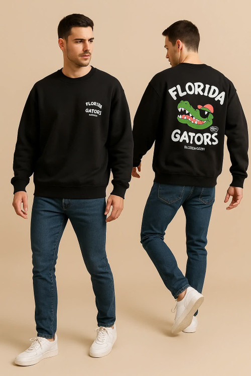 سوییشرت اسپرت مردانه با طرح چاپی فلوریدا روی جلو و پشت، از پارچه گرم و نرم مناسب پاییز و زمستان. طراحی شیک دانشگاهی با رنگ مشکی و چاپ سبز کروکودیل، مناسب استایل خیابانی و روزمره