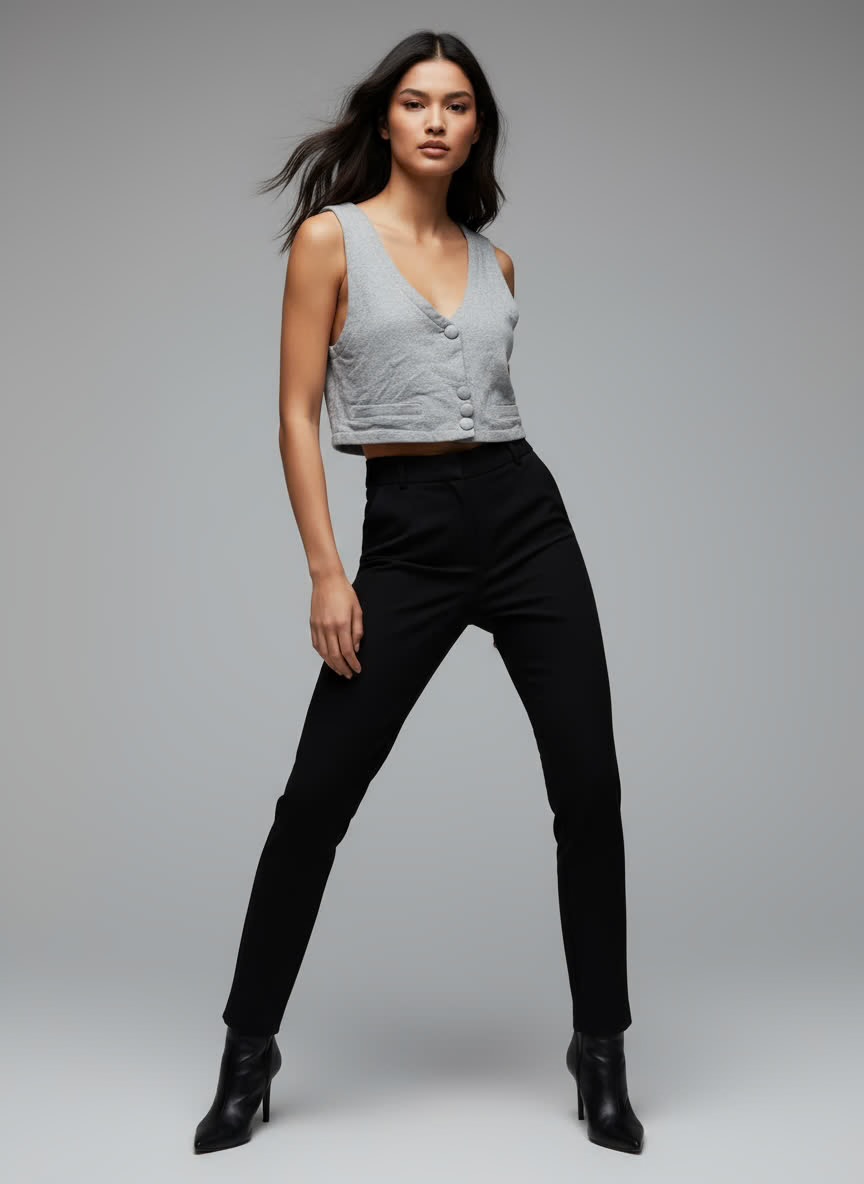 کراپ وست بافت کره ای تاپ زنانه طوسی بدون آستین مدل کراپ با دکمه مخملی جلو