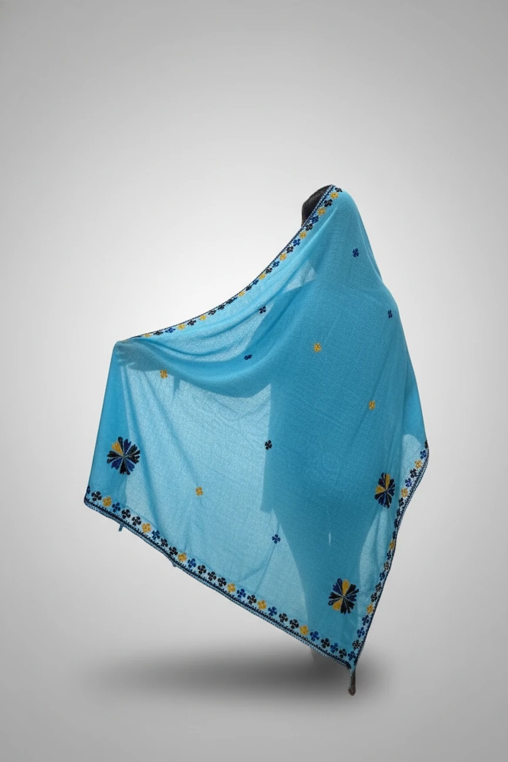 شال آبی فیروزهای زنانه با گلدوزی رنگارنگ دستی، حاشیهدوزی گلدار و پارچه نازک تابستانی